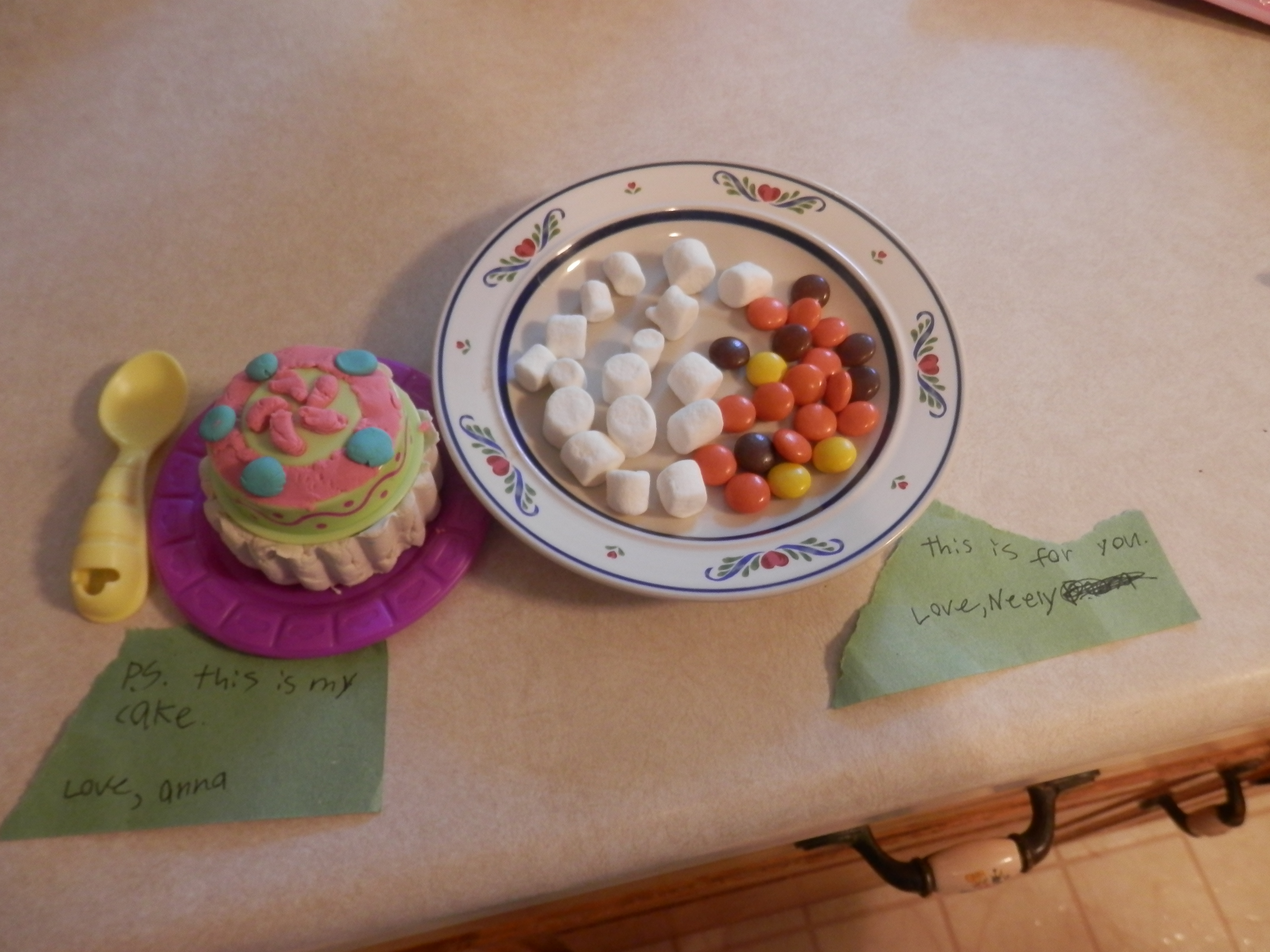 I was trying to clean house one day, that Miss Neenee had a friend over. They decided I needed a snack. Miss Neenee made me a plate of marshmallows & Reeses Pieces. Her friend made me a playdough cake. Both had cute little notes. One note said “This is for you”. The other said, “P.S. This is my cake”. Made me smile.