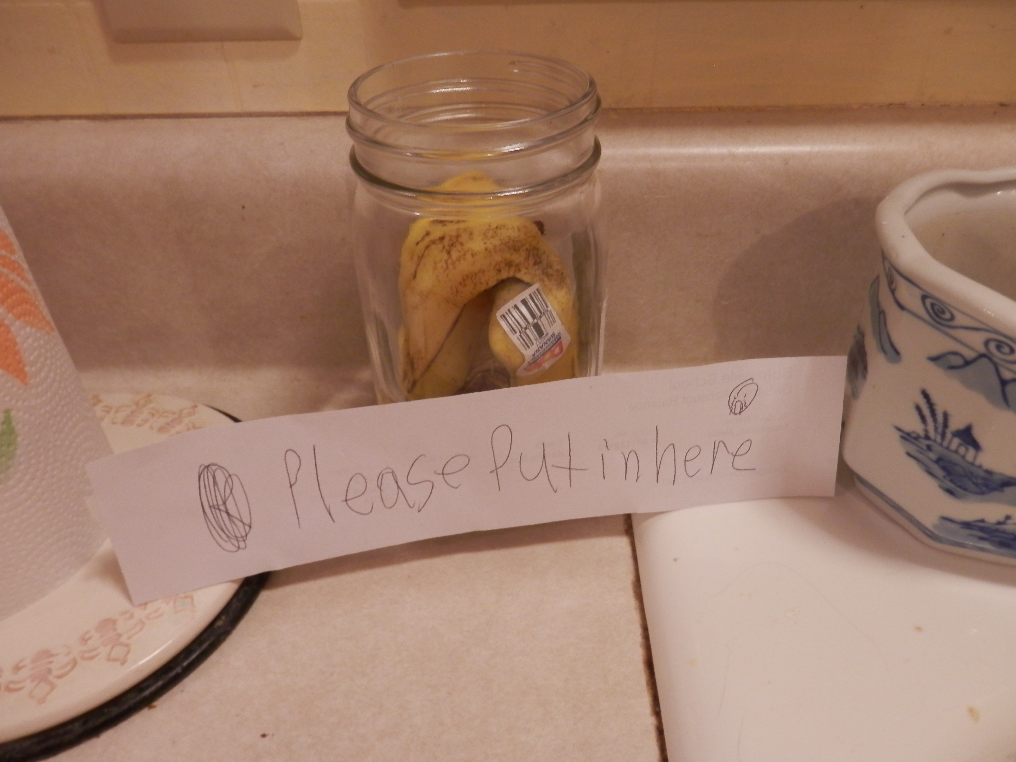 Miss Neenee came home all excited one day this week. She went on & on about how they were learning how to recycle & put good things back in the earth. Apparently, the teacher was teaching about compost. Apparently, we are now making our own compost in the kitchen. Apparently.