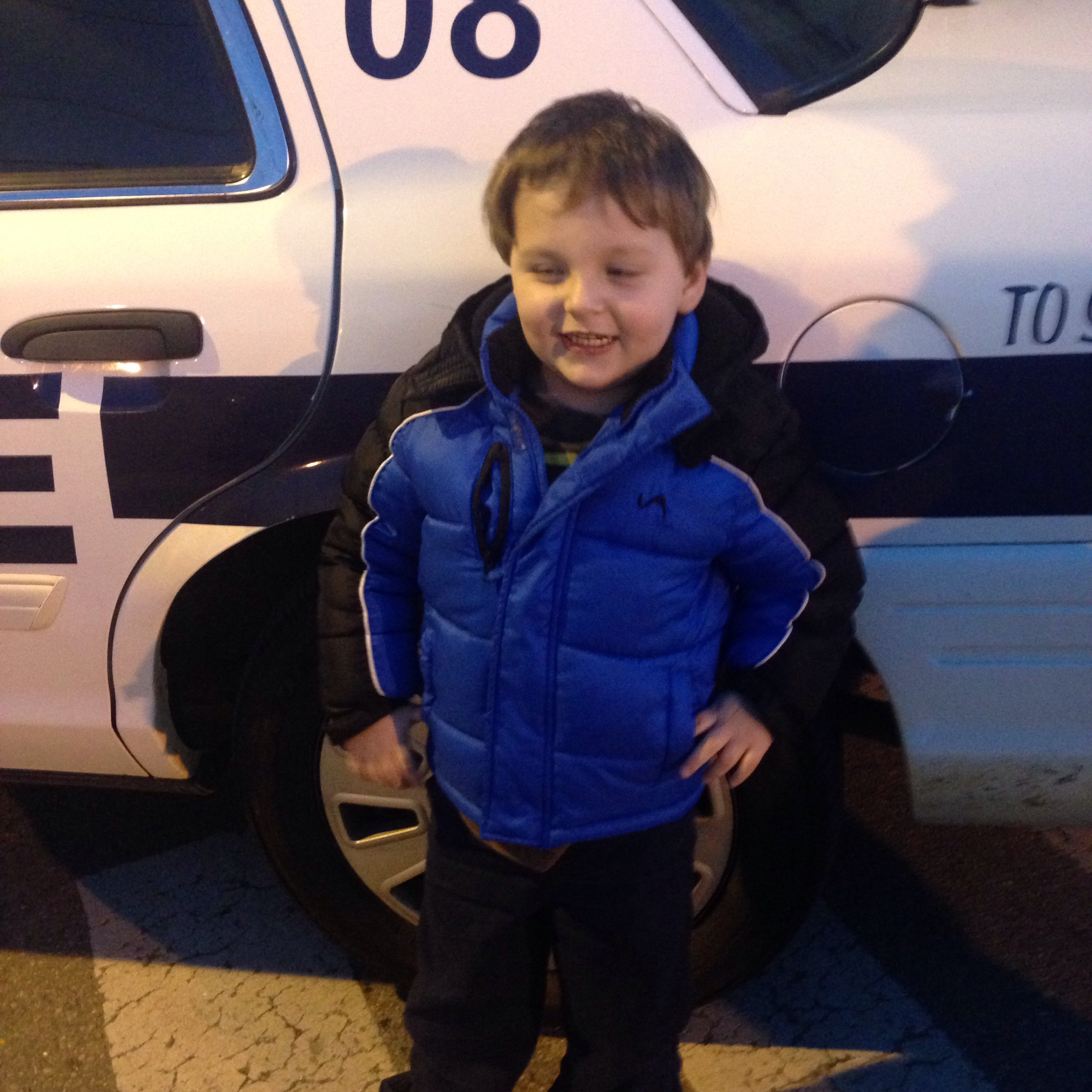 Mr. Sweetie Pants at a Christmas parade saying,”Grand, take my picture beside this police car.”